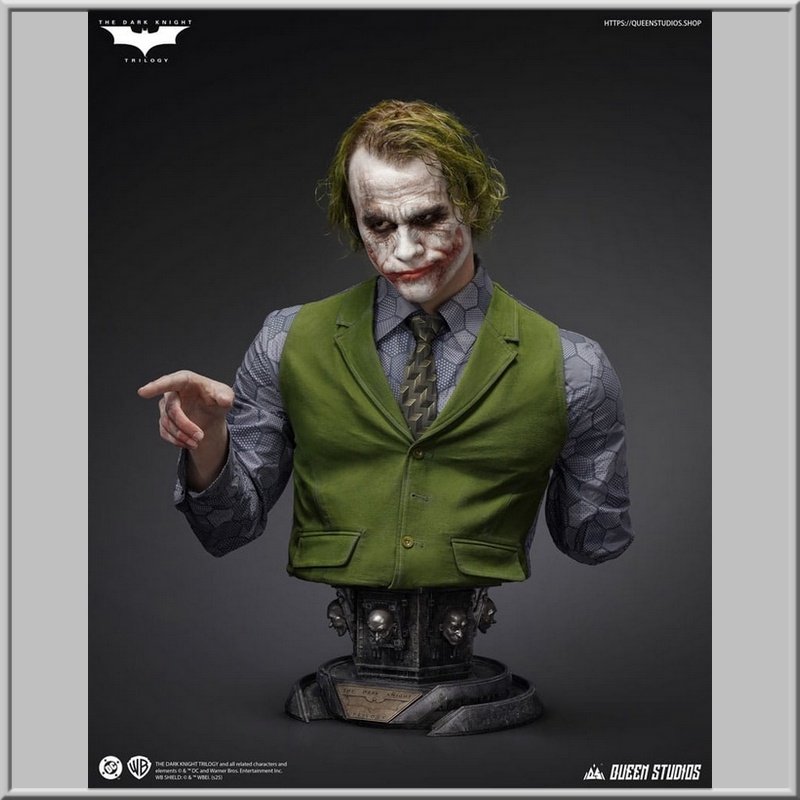 1:1 scale resin bust of The Joker from The Dark Knight, approx. 89 x 75 x 55 cm with base. Exceptionally detailed model, finished and hand-painted in a limited edition by Queen Studios.