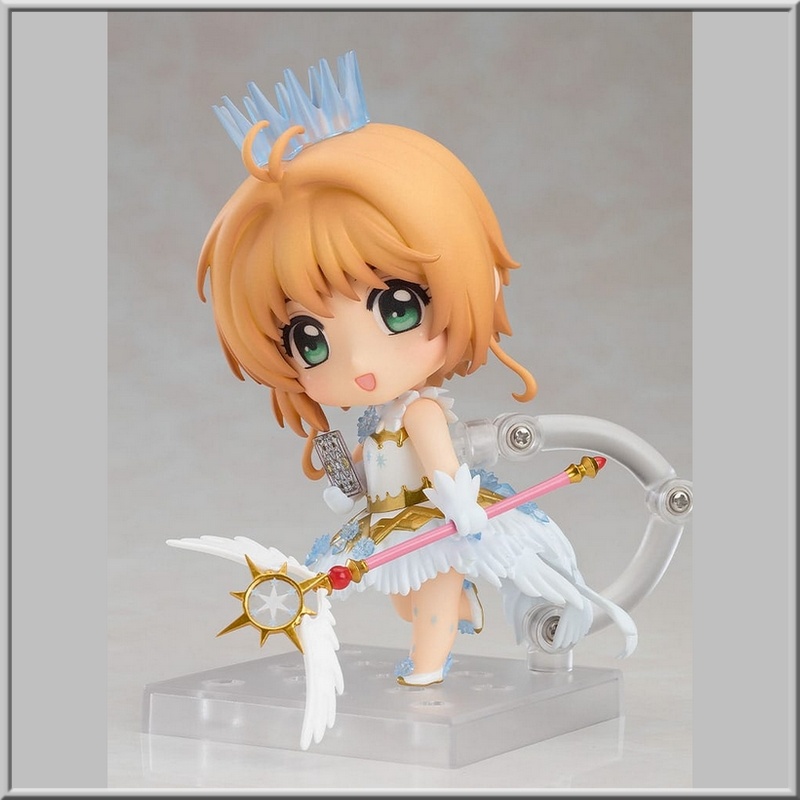 Sakura Kinomoto Clear version articulated figure from the Cardcaptor Sakura Clear Card universe, size approx. 10 cm with accessories. Model manufactured by Good Smile Company in the Nendoroid collection.