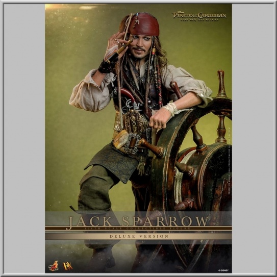 Figurine articulée de Jack Sparrow en version Deluxe tirée du film Pirates des Caraïbes : La Vengeance de Salazar avec fonction lumineuse à l´échelle 1/6, taille env. 30 cm avec accessoires, parties interchangeables et socle, en emballage boîte-fenêtre de collection, fabriqué par Hot Toys et distribué en édition limitée.
