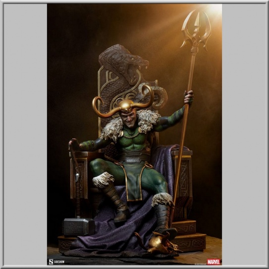 Diorama en résine "Premium Format" de Loki tirée de l'univers Marvel, dimensions env. 59 x 40 x 40 cm sur socle décor. Modèle fini et peint à la main en édition limitée numérotée à 500 exemplaires par Sideshow.