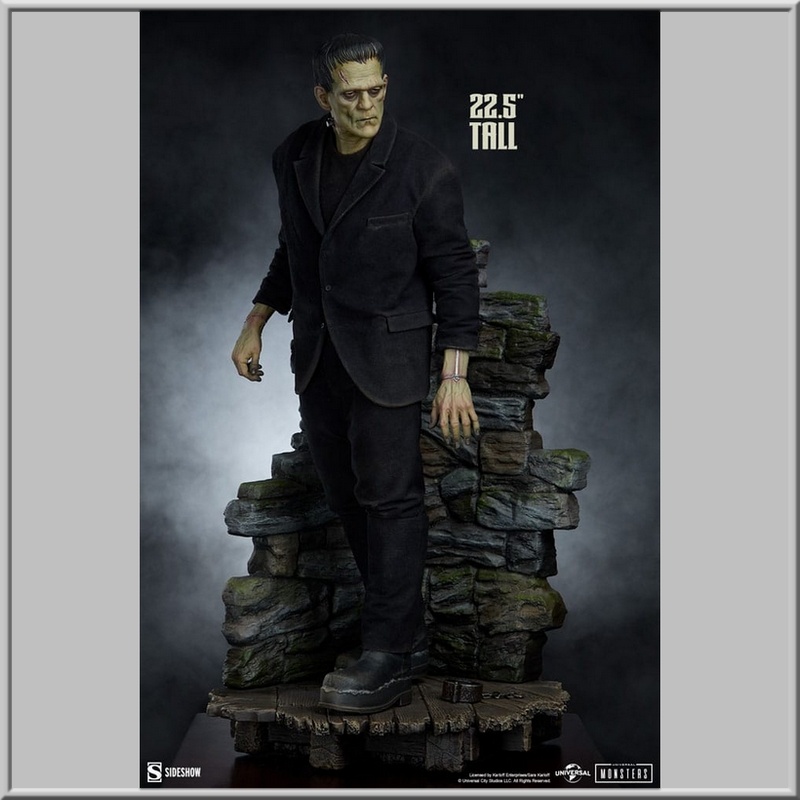 Diorama en résine "Premium Format Mixed Media" de Frankenstein en version Fabric Costume tirée du film Frankenstein, dimensions env. 57 x 32 x 32 cm. sur socle décor. Modèle fini et peint à la main en édition limitée numérotée par Sideshow.