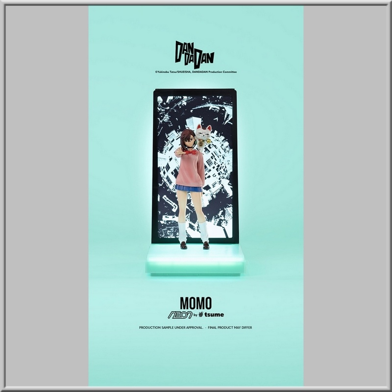 Figurine de Momo tirée du manga et animé Dandadan, sur socle avec fonction LED dimensions 13 x 14 x 25 cm de la collection NEON de Tsume.