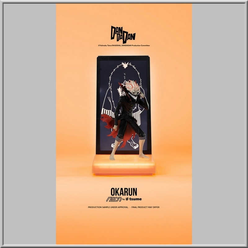 Figurine de Okarun tirée du manga et animé Dandadan, sur socle avec fonction LED dimensions 13 x 14 x 25 cm de la collection NEON de Tsume.